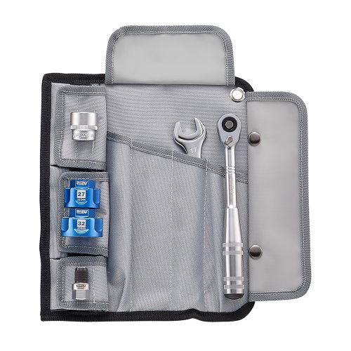Weighing only 2.45 kg, the solid double-layer rolling bag comes with a professional motorbike tool set made of the best materials: the S2 bits with black phosphate rust protection. The base and spanner are Cr-V satin chrome-plated. With its compact dimensions, this motorbike tool bag in Touratech design will always find a place on your bike.