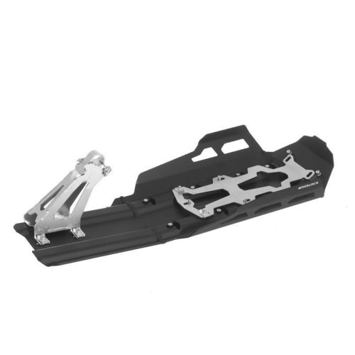 Maximum strength is provided by multiple folded ridges in the 4 mm thick aluminium base plate, while an additional lower stainless steel attachment plate on the engine ensures the force of an impact is distributed over a large area via 6 bolting points. Ground clearance is not restricted by these two base plates.